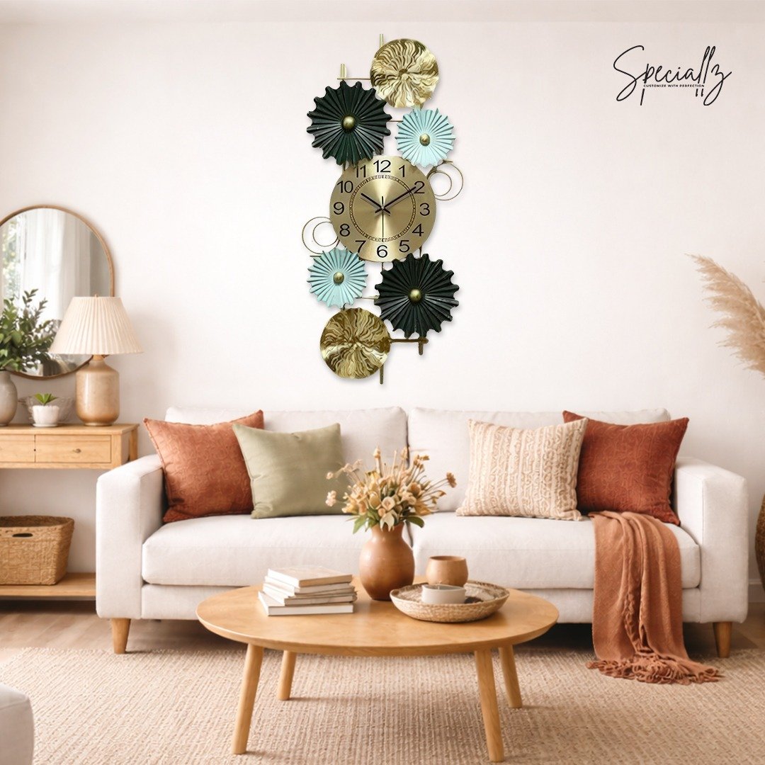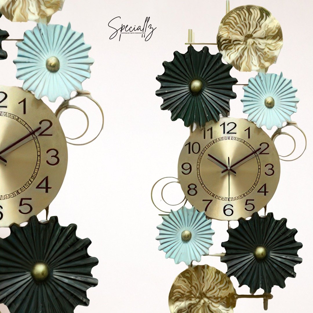 Turn every glance into admiration with the Star Time Decor wall clock — where time meets art. Designed to make a bold style statement, this stunning 3D metal wall clock features an eye-catching floral burst design in rich black, soothing teal, and elegant gold tones, perfectly framing a sleek central clock face.